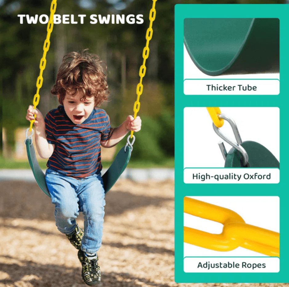• 2 EVA Belt Swings for classic swinging excitement.