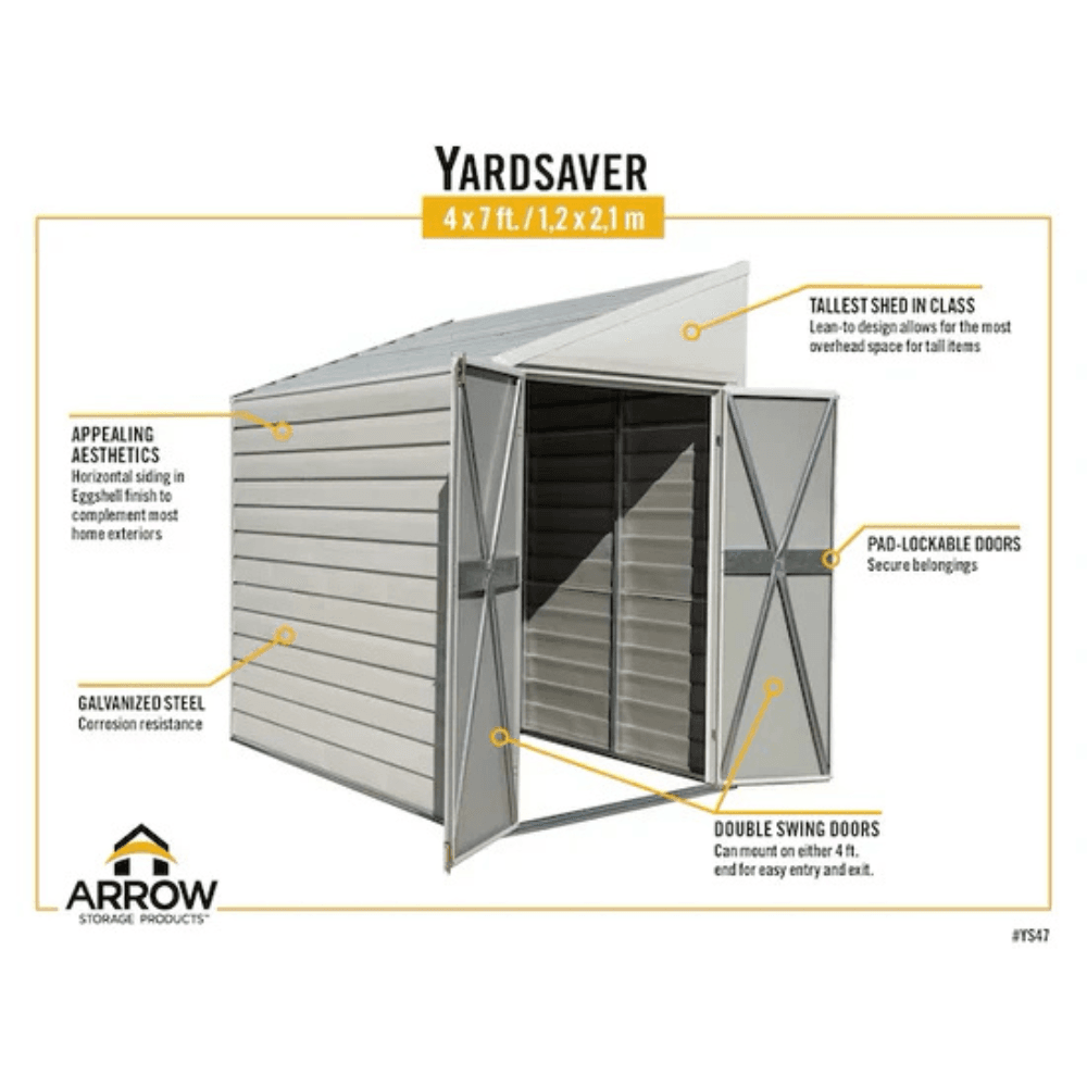 The Arrow Yardsaver 4 ft. x 7 ft. Galvanized Steel Storage Shed offers an