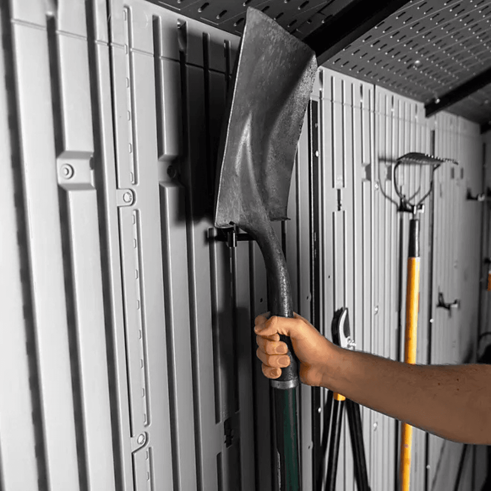 - Customizable shelving system allows for organized storage, making it easy to arrange tools, equipment, and seasonal items.