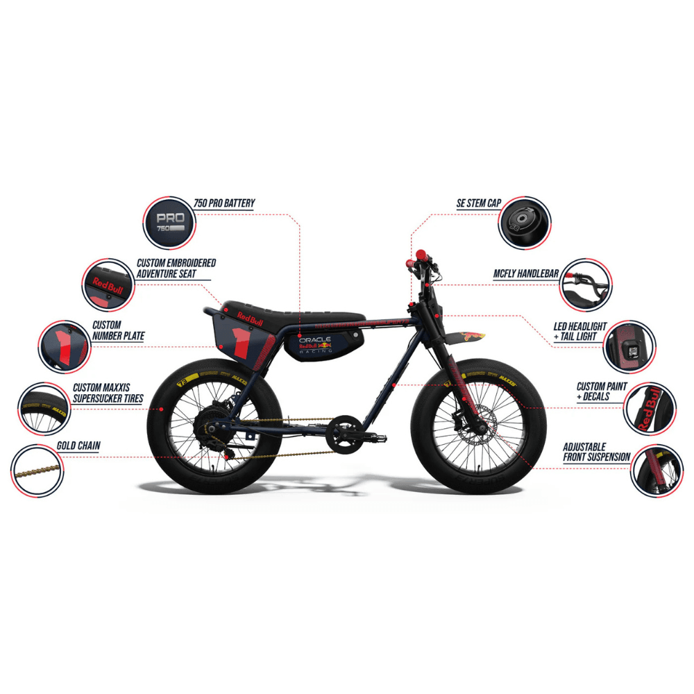 Introducing the custom Oracle Red Bull Racing x SUPER73-Z Adventure Series—a fusion of high-octane performance and retro-inspired design that transforms everyday riding into an adrenaline-fueled experience. This exceptional electric bike is tailored for riders who crave both style and speed, merging Oracle Red Bull Racing’s racing pedigree with SUPER73’s innovative engineering to deliver a ride that stands apart from the crowd.
