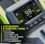 Introducing RYOBI’s first lithium-ion battery powered zero turn riding mower, the RYOBI 80V HP 54″ Lithium Electric ZTR*. HP Technology and 80V batteries combine to deliver the power equivalent of a 42 horsepower gas engine*, while eliminating the hassle and maintenance of a gas mower. This rider cuts up to 4 acres per charge with the help of 5 brushless motors, (3) 80V 10Ah batteries, and (4) 40V 12Ah batteries, with a Hyper Charger that fully recharges in 5 hours so you’re ready for your next job. The revolutionary iDrive system uses an intuitive one-handed joystick steering to maneuver around objects more easily than a traditional ZTR. The innovative LCD screen displays runtime, battery life, and cut/drive speed while in use, while the Riding Mower app allows you to monitor charge time and battery life remotely. This riding mower features the CROSS CUT multi blade system, providing superior cutting & mulching performance, while the 12-point height adjustment allows you to select the perfect cutting height between 1.5″ and 4.5″. The rubber side discharge chute makes it easy to maneuver around landscaping so users are not restricted by where they can cut. Designed with comfort and convenience in mind, this mower features premium seat suspension, 2 USB ports to charge phones, a storage compartment, and LED headlights. Mobile Service available in select regions. If your riding mower requires attention, a certified RYOBI support technician can diagnose & service right from your home. Some services may require you to bring your mower to one of the 300+ service centers nationwide. Lawn maintenance will never be the same thanks to the RYOBI 80V HP Brushless 54″ Lithium Electric Zero Turn Riding Mower.