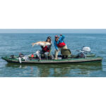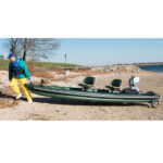 FishSkiff 16 Solo Startup Package Indlues: FishSkiff™ 16 Hull, Green Swivel Seat Fish Rig, SUP Paddle, Boat Carry Bag for FSK16, SUP Pump, 7″ Pedestal, Repair Kit.