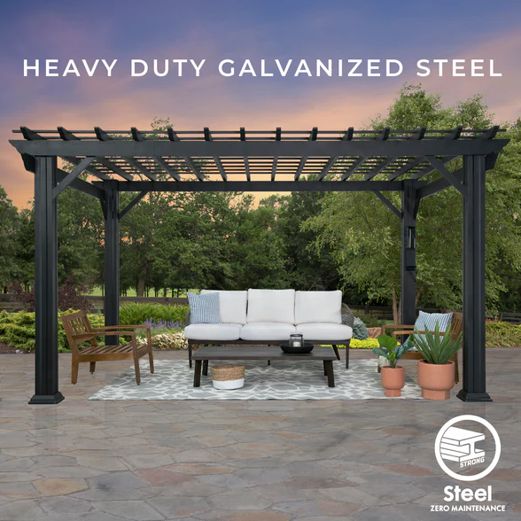 Traditional and timeless, the Stratford Steel Pergola by Backyard Discovery brings effortless charm to your outdoor living area. This stunning patio pergola combines enduring craftsmanship with modern sophistication, featuring a stylish black finish that creates a bold, striking aesthetic. Engineered with powder-coated galvanized steel, it delivers maintenance-free durability while providing superior protection against rust, chipping, corrosion, and UV damage. The elegant design provides plenty of shade with the integrated pergola canopy. This soft shade sail filters sunlight while offering protection from the elements, creating the ideal balance of shelter and ambiance. Pro-Tect™ tested and proven to withstand winds up to 100 mph*, this outdoor metal pergola stands strong through adverse weather conditions. Its generous size provides plenty of room for furniture, fire pits, and outdoor décor to create the perfect space for gatherings or simply relaxing. The patented PowerPort™ features three electrical outlets and three USB ports, making it easy to power your outdoor entertainment needs. This ready-to-assemble backyard pergola kit offers step-by-step guidance with the BILT® app, for easier installation.