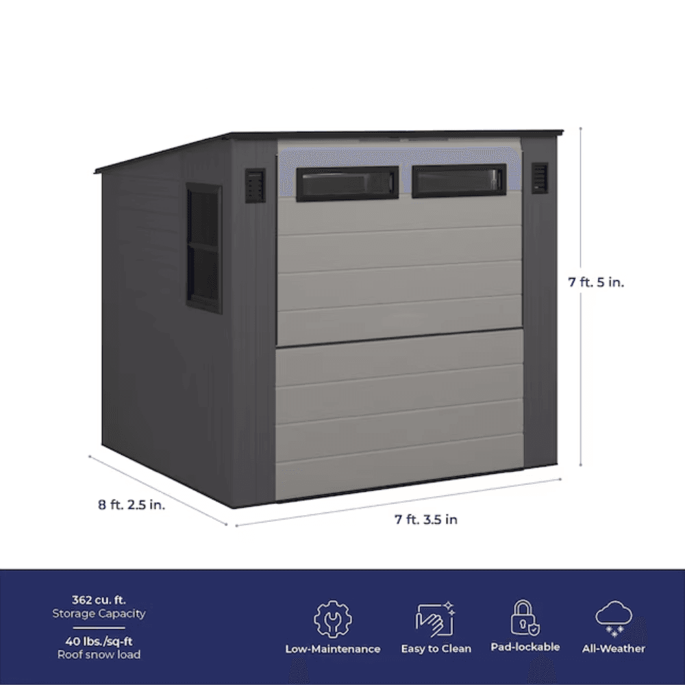 - Spacious 362 cu. ft. interior offers ample room for tools, gardening equipment, and outdoor essentials.