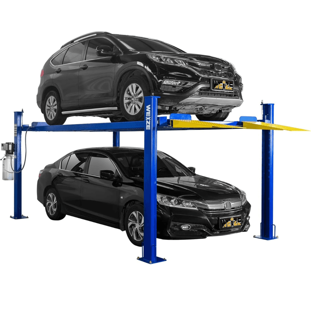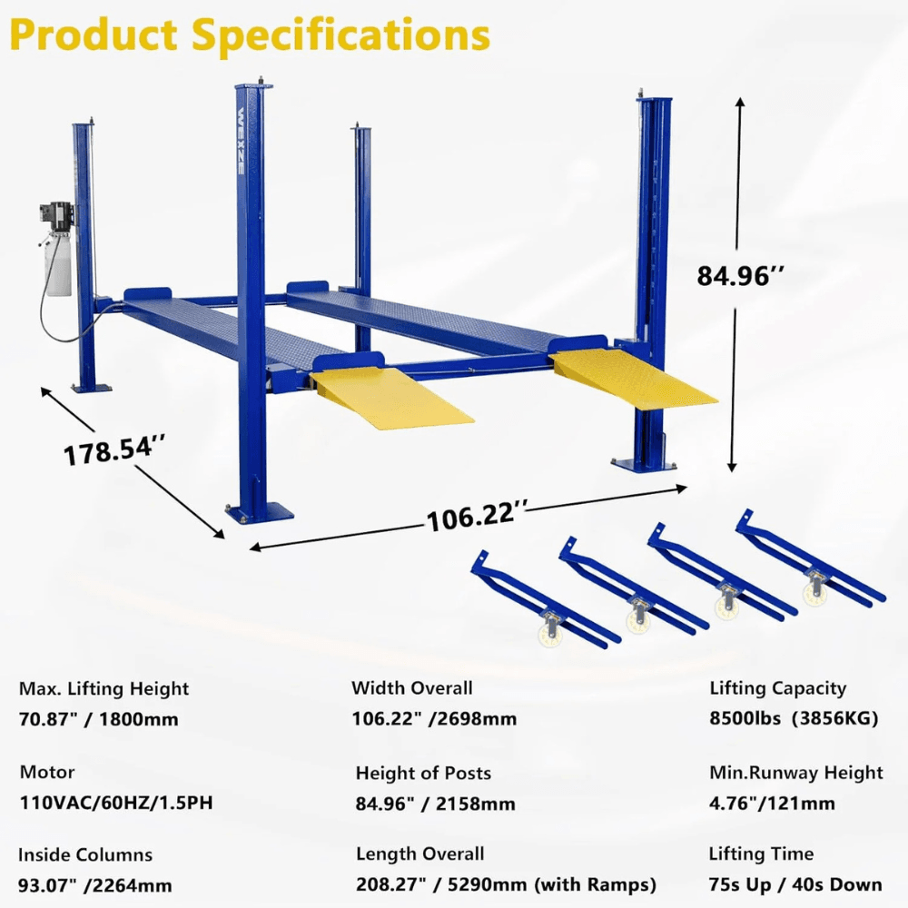 Upgrade your garage with the WEIZE 8,500 LB 4-Post Lift – built for heavy-duty lifting and long-term convenience!