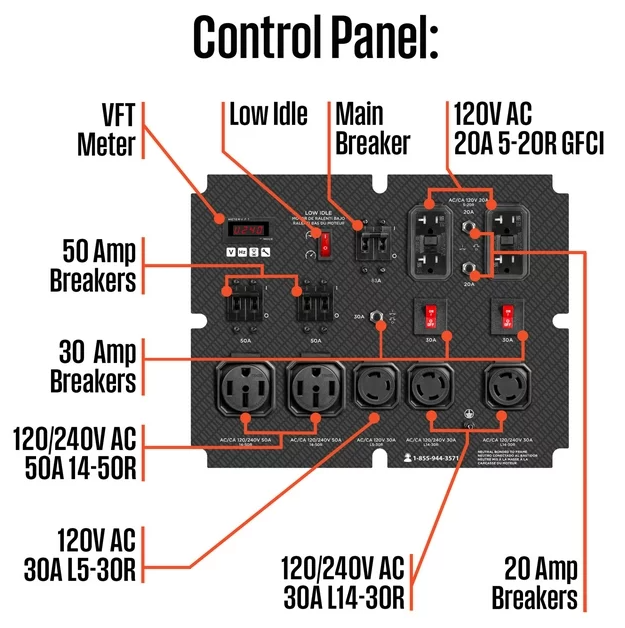 • Featuring Four GFCI 120V 5–20R Standard Household Outlets, Two 50A 120/240V 14-50R Outlets, Two 30A 120/240V L14-30R Outlets, and One 30A 120V L5-30R Outlet; All Outlets Have Rubber Covers for Added Safety
