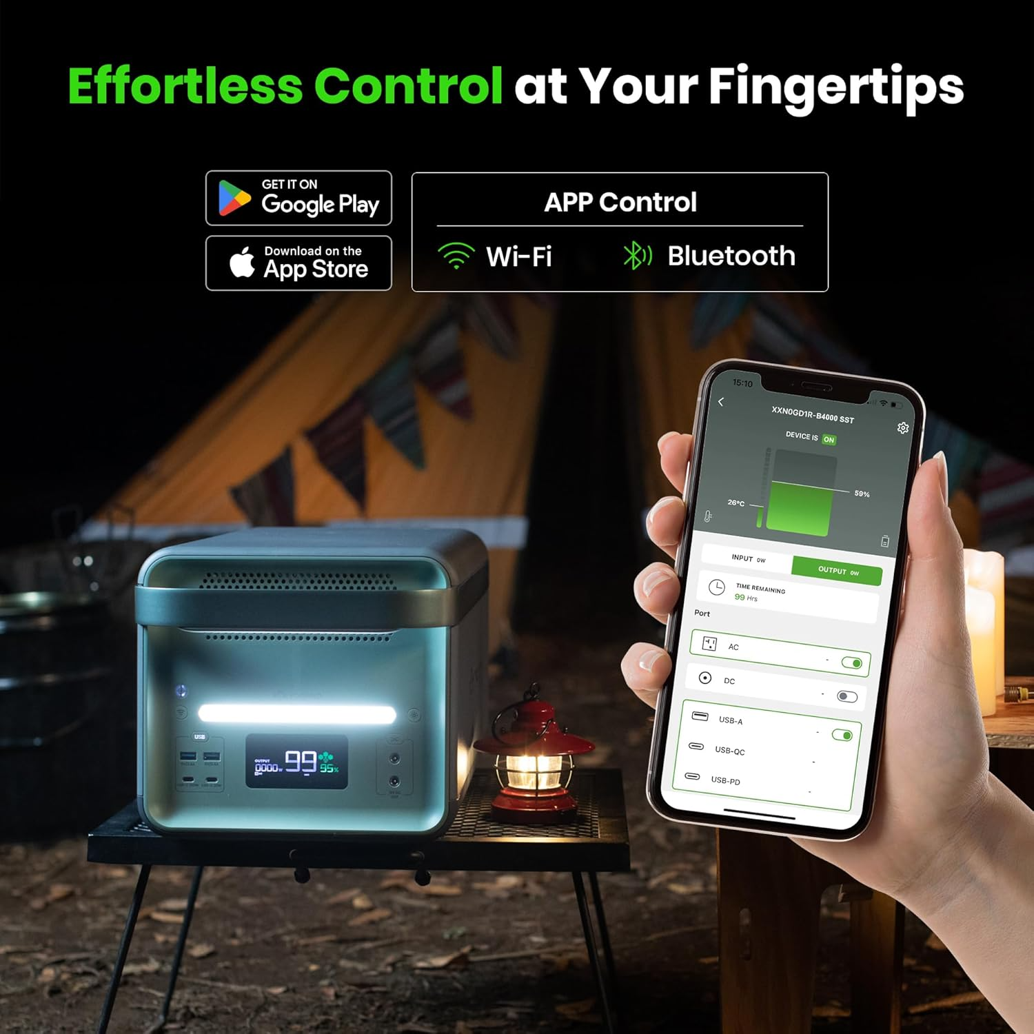 With its solid-state technology (SST), the B4000 SST is safer, more compact, and lighter than traditional lithium-ion batteries. It comes with two 15-watt wireless charging pads, Wi-Fi and Bluetooth app control, and a 10-port control panel, giving you multiple ways to power your devices simultaneously. The unit also supports Smart Link, allowing you to connect additional batteries and expand capacity for larger needs.
